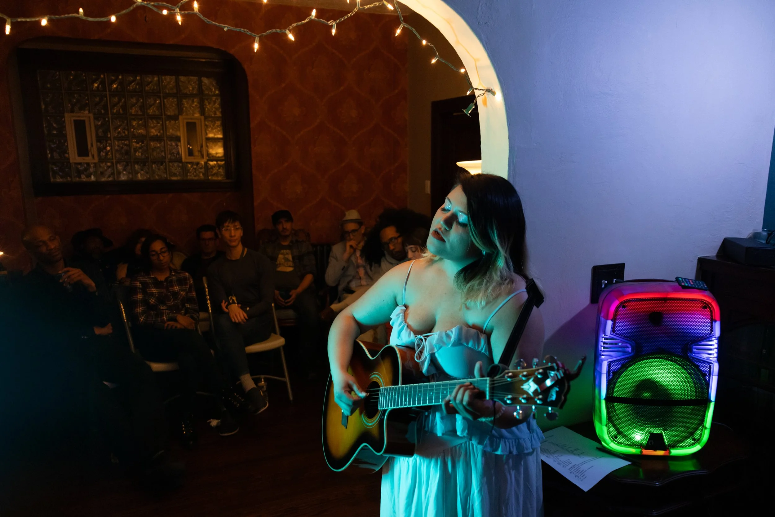 This Literary Evening is an immersive experience that blends elements of a traditional literary salon with the allure and intimacy of a speakeasy. Poets will perform their work in a theatrical and engaging manner in a dimly lit and elegantly decorated secret location. Guests will watch the main performances and then, if desired, can reserve time for a more personal experience with designated performers one-on-one. The event also features different performers each time such as live musicians, burlesque performers, flow artists, fire dancers and tarot readers. The 1 on 1 experiences vary from show to show as well depending on the featured artists.